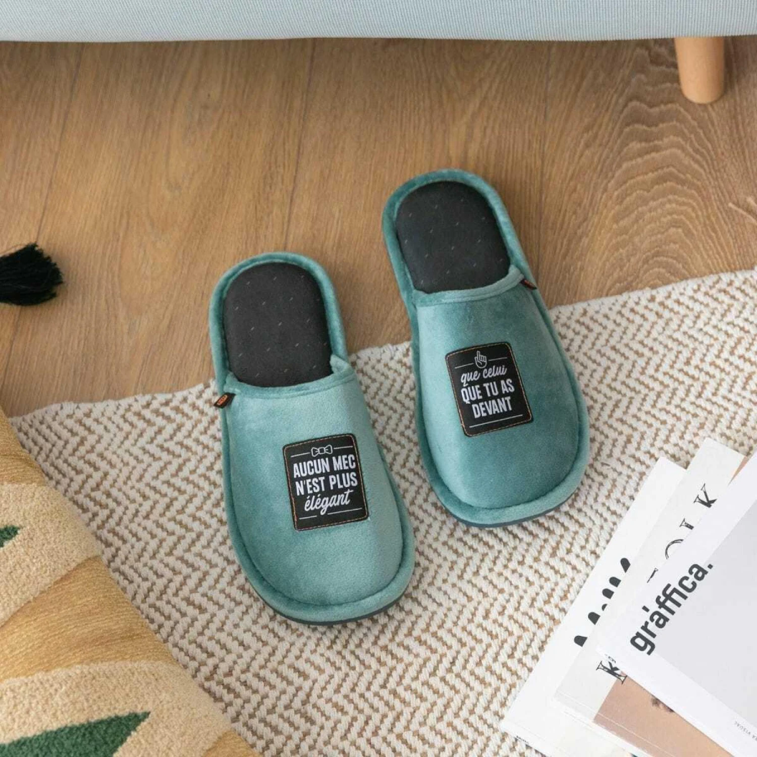 Chaussons en polyester très doux, avec un message réparti entre les deux chaussons, Ils présentent un motif à l’intérieur, Semelle extrêmement souple pour le confort, Disponible en deux tailles : 40-43 et 44-46,