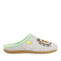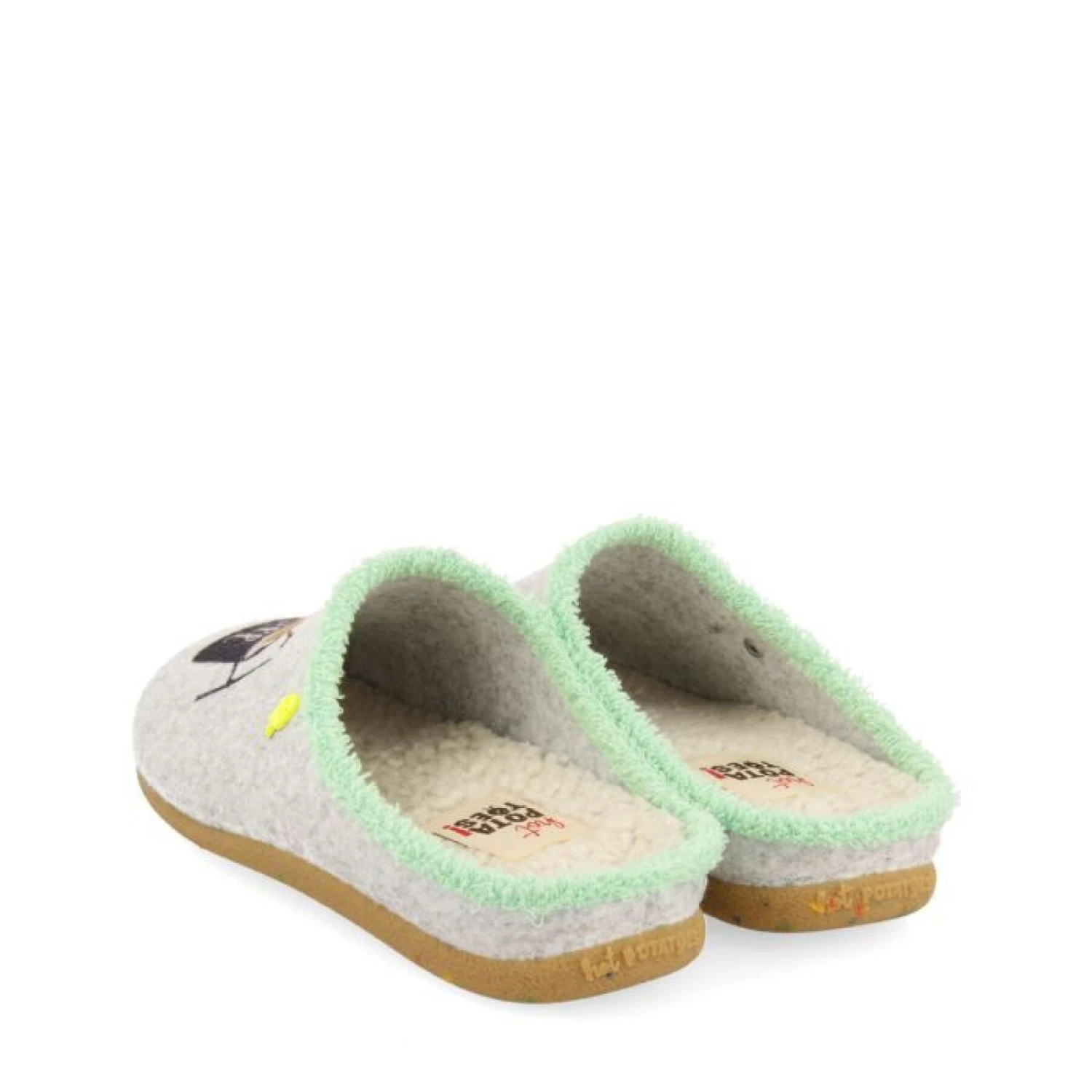 Les chaussons les plus confortables, les plus rigolos et les plus durables sont chez Hot Potatoes ! Chaussons de type babouche couleur grise. Découpe en feutre PET. Bordure en fourrure et semelle en mouton. La semelle est escamotable, en mousse de polyuréthane 100 % recyclé et la semelle extérieure est en caoutchouc naturel dans les tons caramel avec zébrures colorées en gomme EVA.