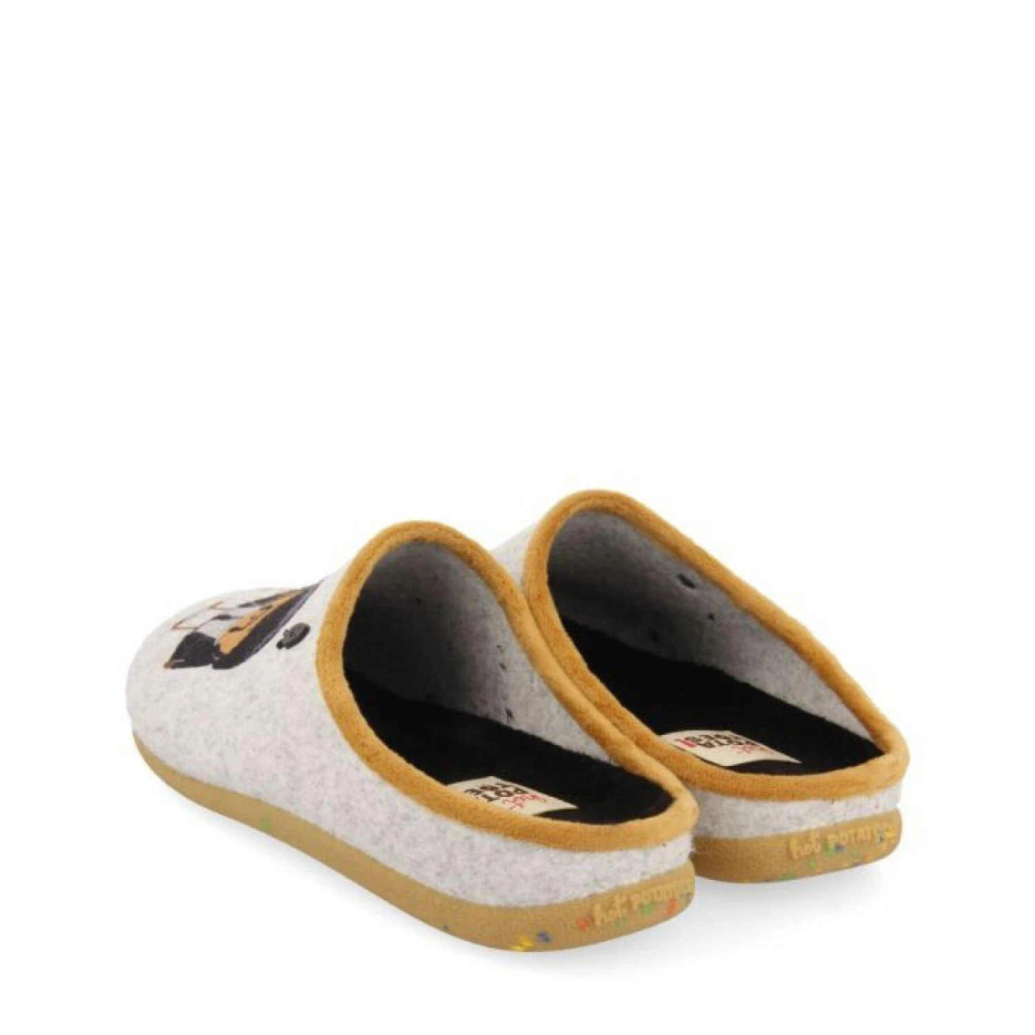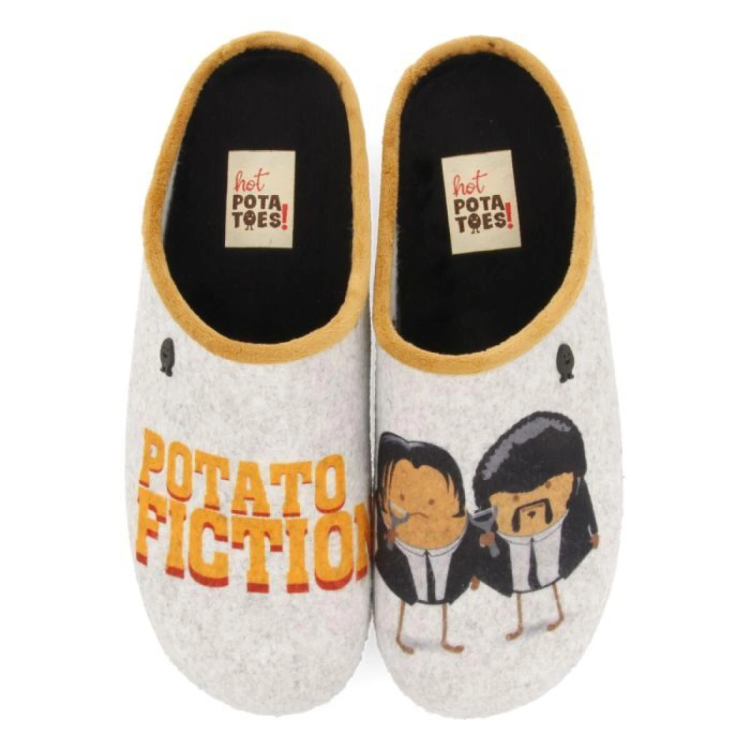 Bienvenue dans l’univers de Hot Potatoes. Pantoufles grises de style mule à l’effigie de notre pomme de terre Pulp Fiction. Fabriquées en feutre PET. Garniture et semelle intérieure en fourrure noire très douce. La semelle intérieure amovible est en mousse de polyuréthane 100 % recyclée et la semelle est en liège naturel de couleur caramel avec des mouchetures colorées en caoutchouc EVA.