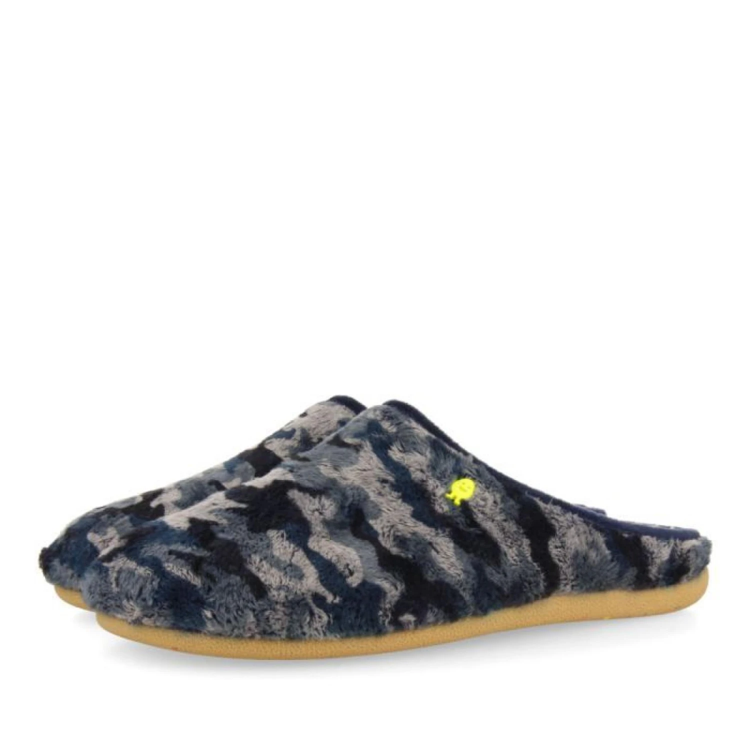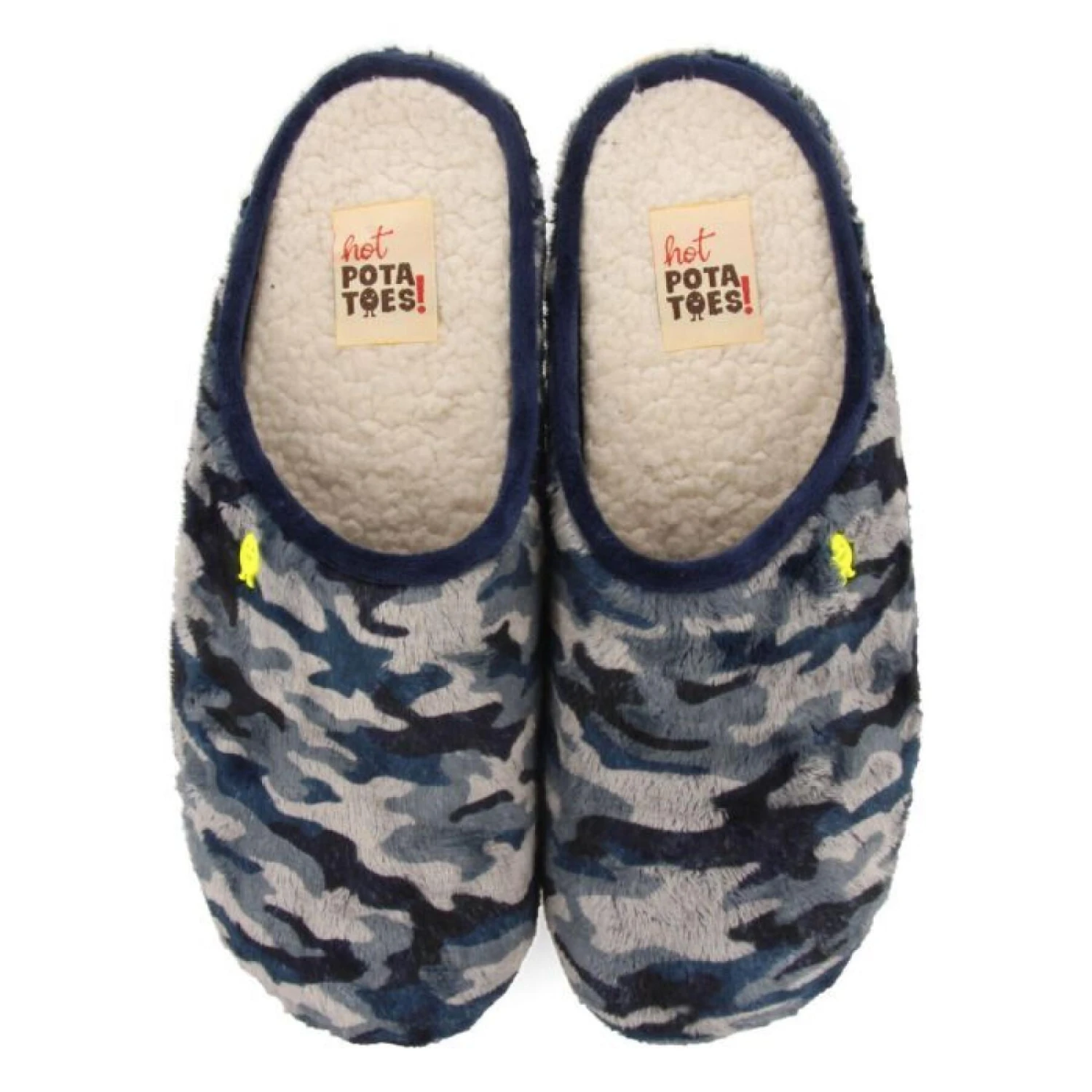 Vous allez adorer la nouvelle collection Hot Potatoes ! Pantoufles de style mule en fourrure douce à imprimé camouflage bleu. Semelle intérieure en peau de mouton douce. La semelle intérieure amovible est en mousse de polyuréthane 100 % recyclée et la semelle est en liège naturel de couleur caramel avec des mouchetures colorées en caoutchouc EVA.