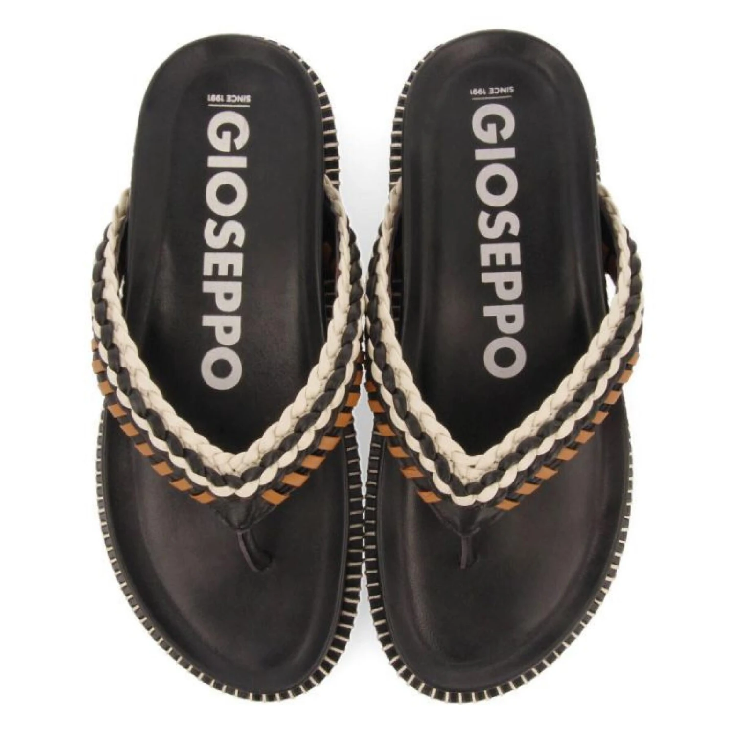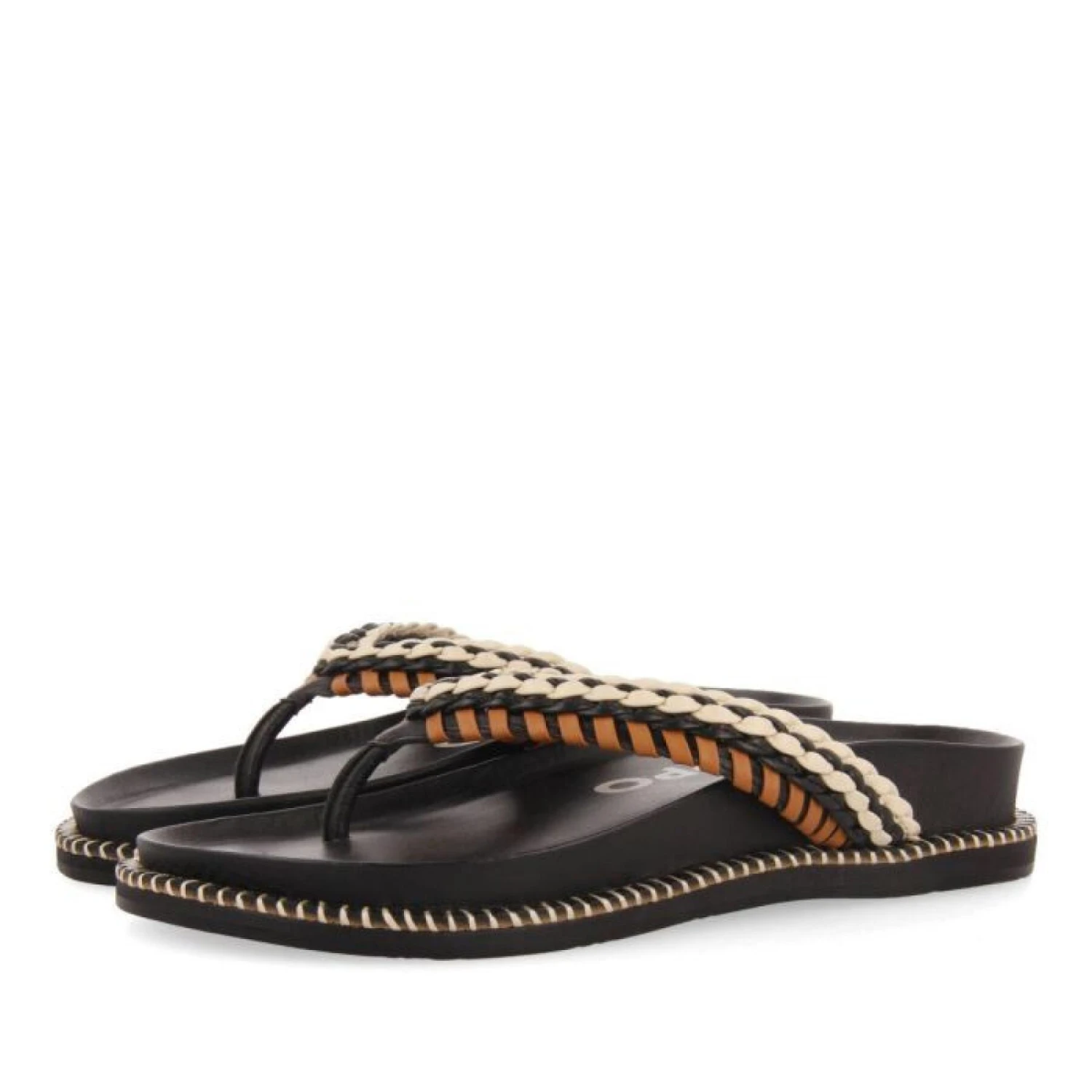 Indispensable pour tout l’été ! Sandales noires avec une large bride en cuir sur le cou-de-pied, agrémentée de surpiqûres décoratives et d’un galon multicolore. Semelle intérieure en cuir avec rembourrage en latex qui garantit un confort supplémentaire. Semelles souples.