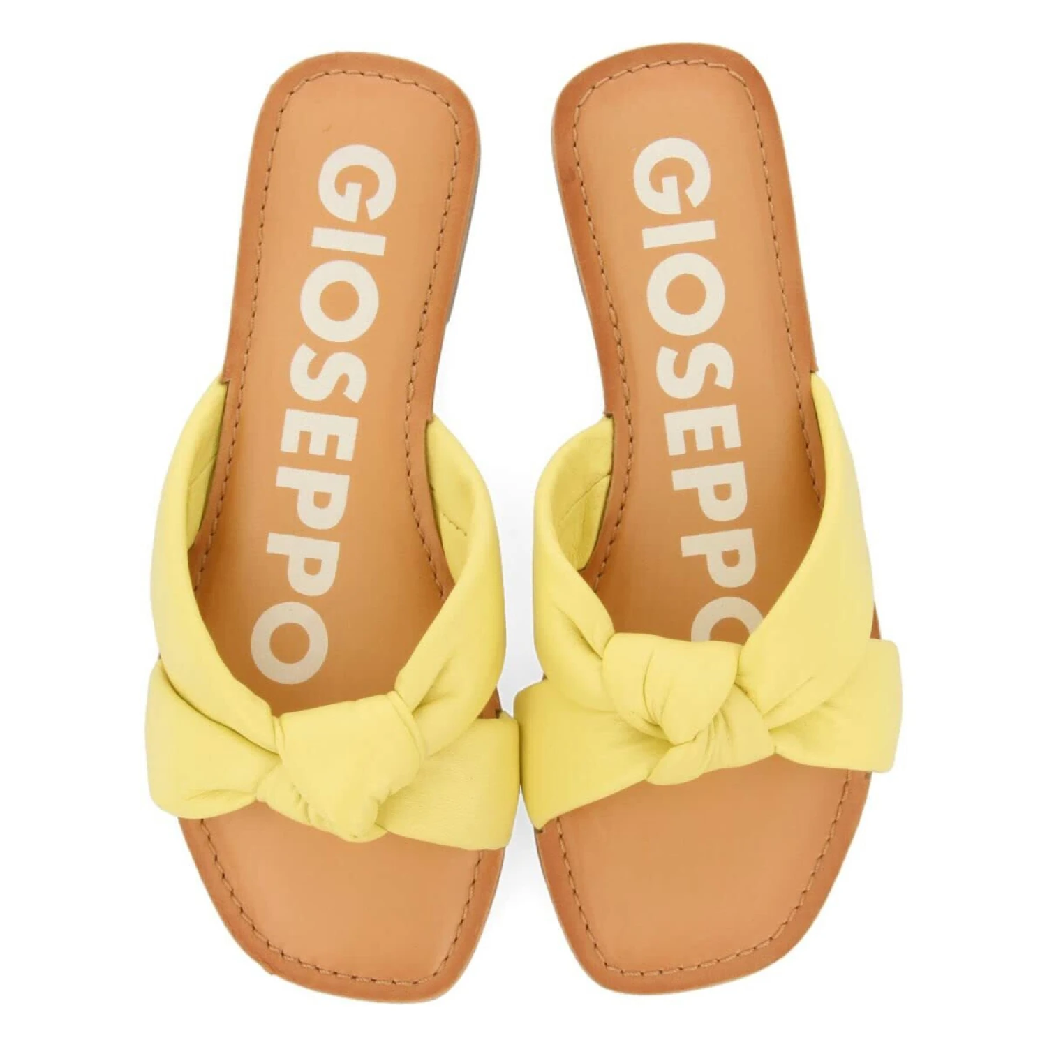 Sandales en cuir mule jaune avec détail nœud. Semelle intérieure rembourrée en latex. Semelle intérieure en cuir tanné selon un procédé plus durable selon les normes du Working Leather Group. Semelle très souple pour assurer un maximum de confort. Un basique qui ne peut pas manquer dans votre placard